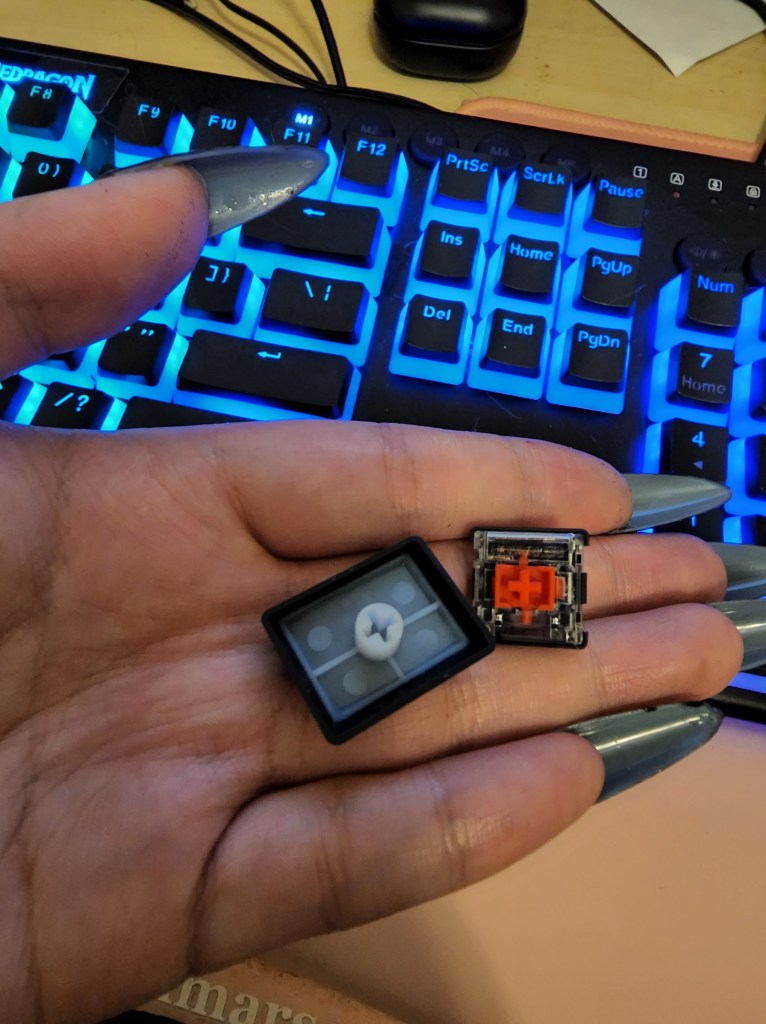 The first problem I encountered when using the keyboard was the wide gap between the keycaps. Since the keycaps are low-profile—meaning they’re very thin—the wide gap meant that my fake nails could slip through the gap and get stuck underneath the keycaps, which was both painful and frustrating.